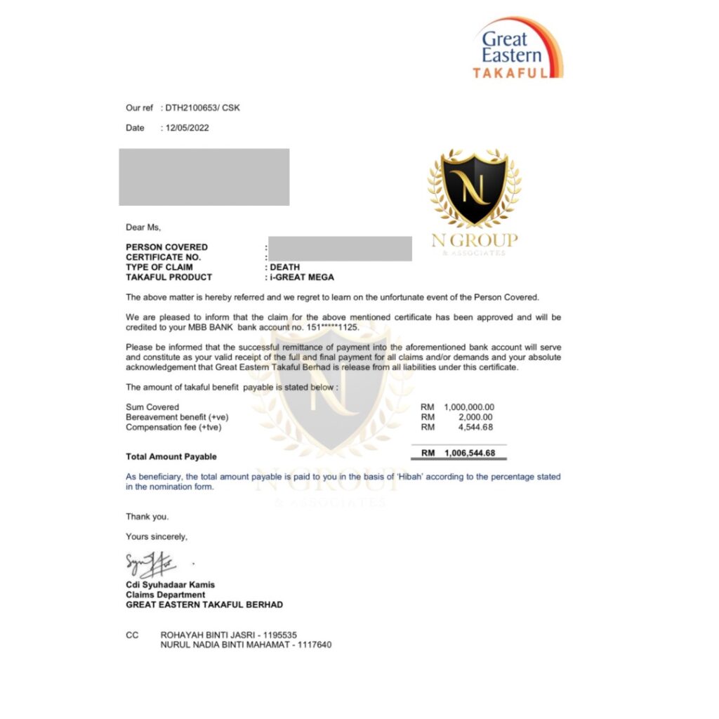 Alhamdulillah, proses tuntutan berjalan lancar. Waris menerima pampasan hibah RM1,006,544.68 terus ke akaun bank.